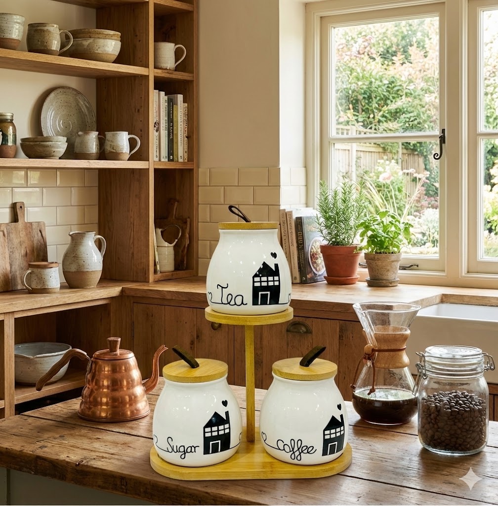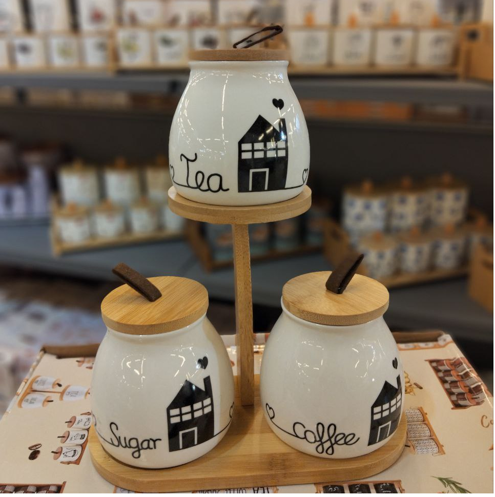 Set of 3-piece porcelain sugar jars for storing tea sugar and coffee with cute home design and wooden lids with multi-level wooden display base