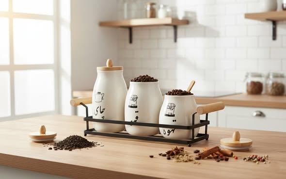 Set of 3-piece porcelain sugar jars for tea coffee and sugar white porcelain with Persian drawings and wooden lids inside metal holder