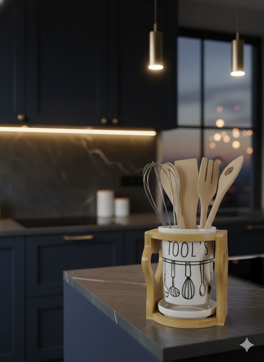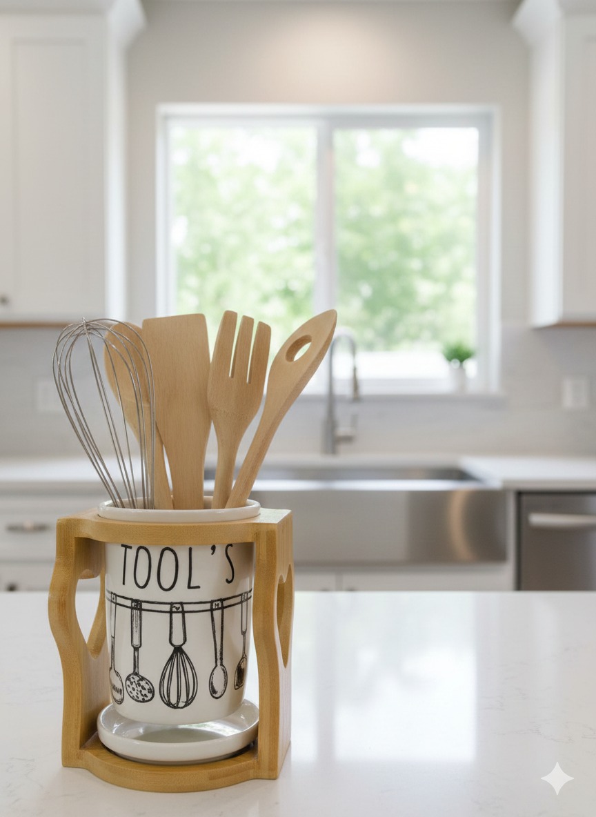 Utensil Holder Set 5 pcs (4 serving utensils and stainless steel whisk) with porcelain holder and bamboo wooden base ZY367-1