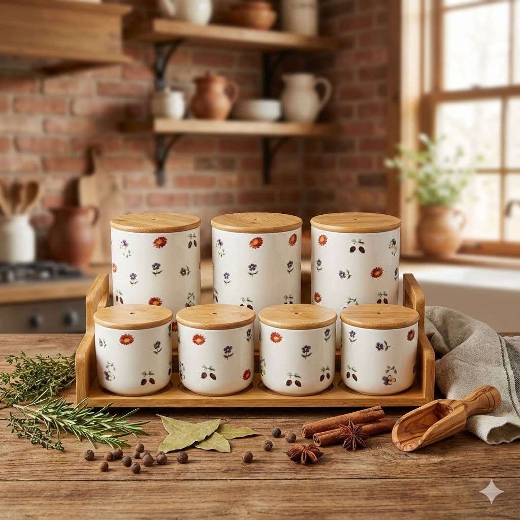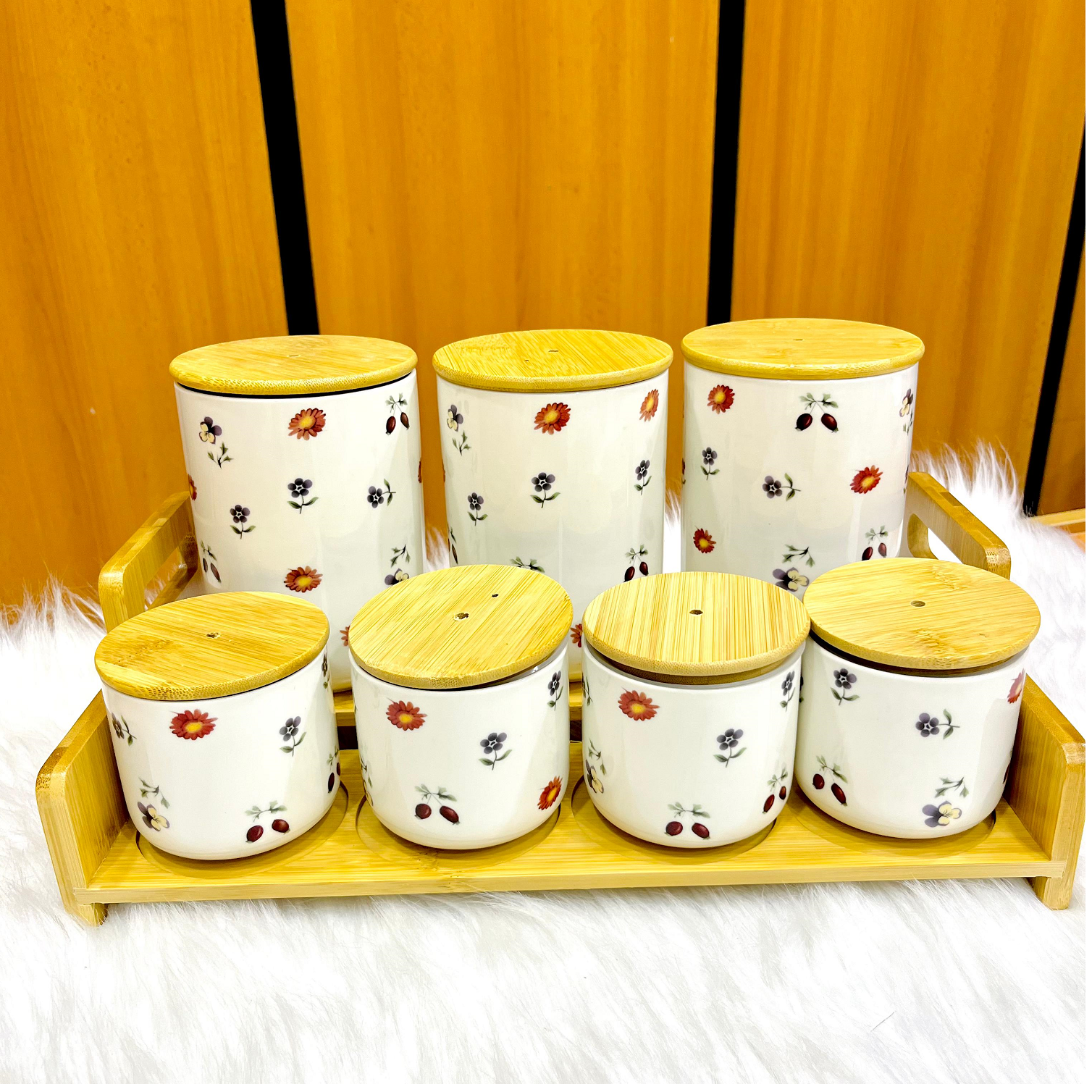 Set of 7-piece creamy porcelain spice jars with natural light wooden lids with conical handles including 3 tall and 4 short jars placed inside a matching wooden tray ideal for kitchen organization