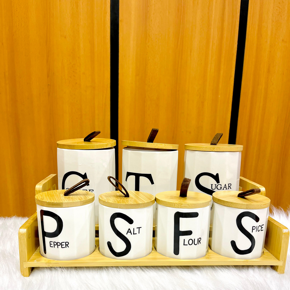 Set of 7-piece porcelain spice jars equipped with wooden lids with leather loops and double wooden display base with modern design and embossed English letters ZY340-2