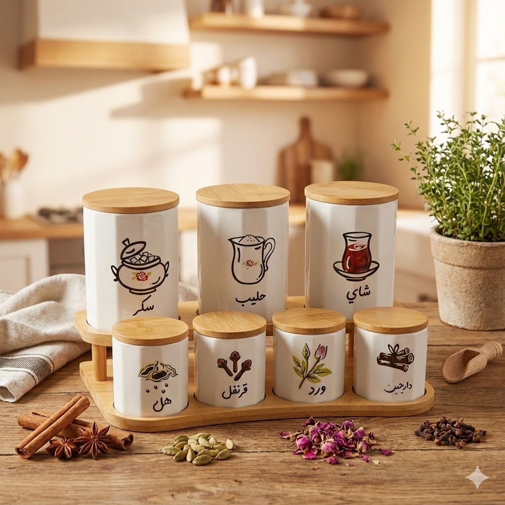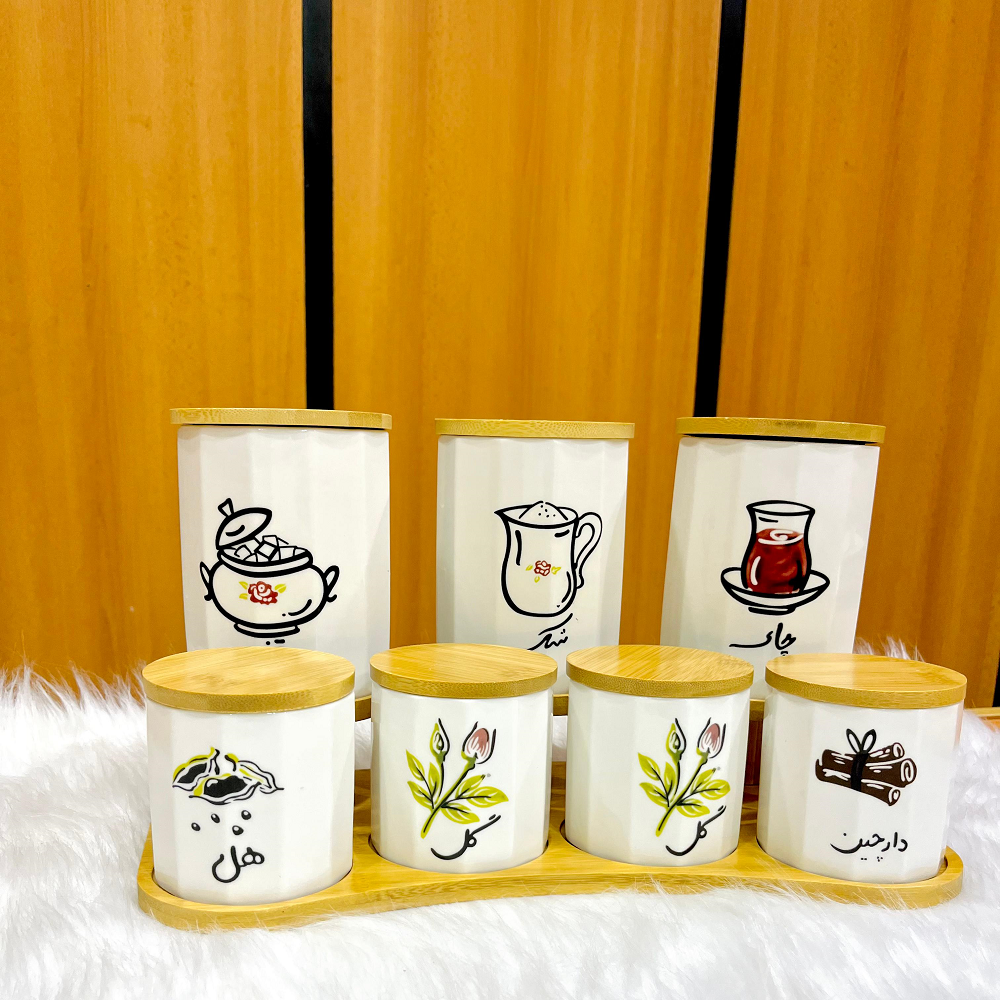 Set of 7-piece porcelain spice jars with white porcelain design and Persian art on wooden base
